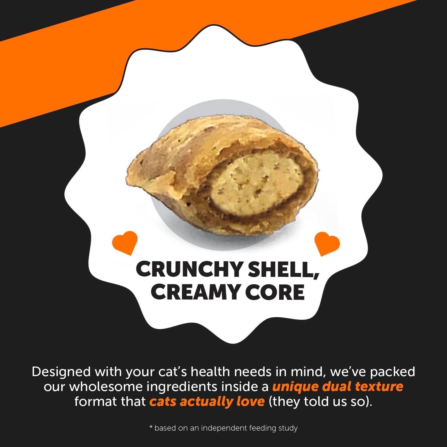 ’s Hip + Joint Health dual-texture cat chews feature a delicious crunchy shell and a creamy filling that your cat will love. This unique formulation incorporates powerful ingredients such as glucosamine, green-lipped mussel, calcium fructoborate, and manganese to support joint health, ensuring your cat can keep pouncing and playing without discomfort. Easy to give and tasty, these chews eliminate the need for powders or gels. Additionally, ’s Skin + Coat Health for cats provides a delicious solution to help calm and soothe your cat's skin, enhancing their comfort while they play. With powerful ingredients like omega fatty acids, vitamins C and E, and biotin, these chews offer advanced support for skin and coat health, nourishing and promoting a shiny, healthy coat. The dual-texture format combines a crunchy outer shell with a creamy, savory filling that cats adore.